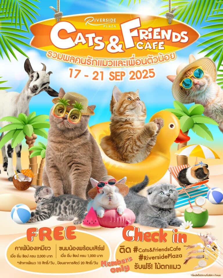 Cats & Friends Cafe รวมพลคนรักแมวและเพื่อนตัวน้อย 17 – 21 ก.ย. 2025 | Riverside Plaza ชั้น 1 ลาน Event Hall มาสนุก ฟิน และใกล้ชิดกับน้องเหมียว & เพื่อนตัวน้อยกันได้ที่งาน! พิเศษสำหรับสายช้อป *ฟรี! ขนมน้องพร้อมเสิร์ฟ เมื่อ อิ่ม ช้อป ครบ 1,000.- (20 สิทธิ์/วัน) *ฟรี! เข้าคาเฟ่น้องเหมียว เมื่อ อิ่ม ช้อป ครบ 2,000.- (10 สิทธิ์/วัน) . วันงานเช็กอินติด #Cats&FriendsCafe #RiversidePlaza รับฟรี! ไม้ตกแมวสุดน่ารัก งานนี้ห้ามพลาด! พาน้องๆ…
